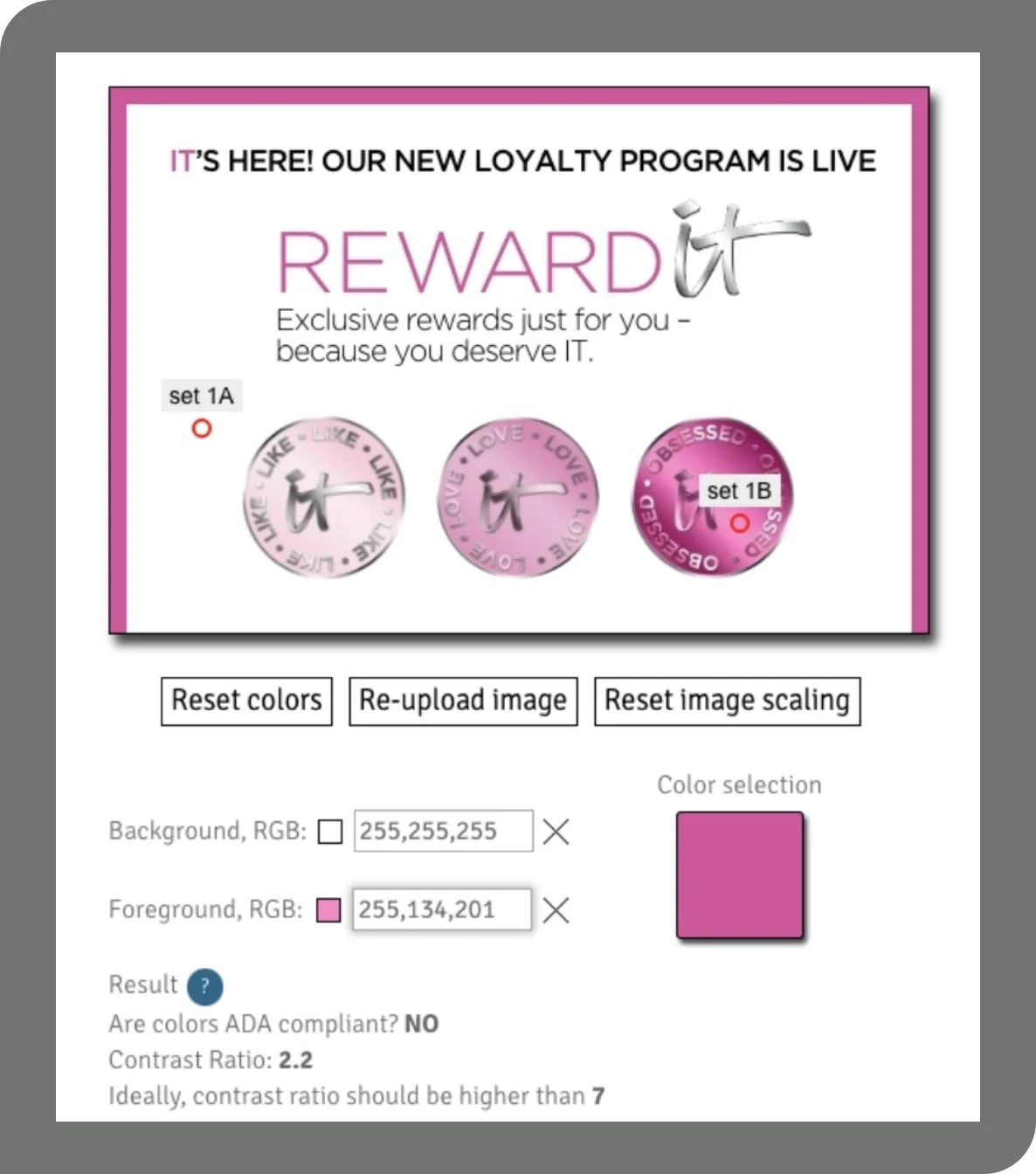 I conducted a self-initiated accessibility audit of IT Cosmetics’ loyalty program RewardIT. The asset package was created by an external agency working with the global digital team, then shared with my US team.